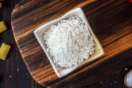 Packaging of rice for making risotto. Vacuum packed to preserve the quality of rice grains. A modern way to store cereals. Rectangular packaging for placing inside a cardboard box