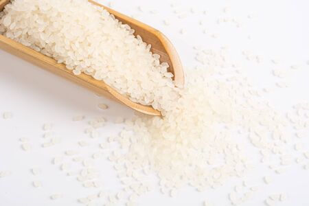 Raw white polished milled edible rice crop on white background in brown bowl, organic agriculture design concept. Staple food of Asia, close up.