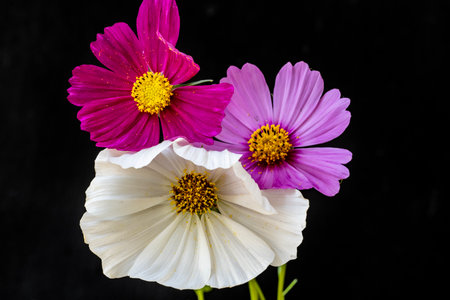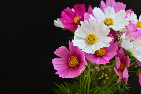 Cosmos flowers bouquet on black background with copy space for text