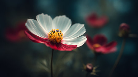 Elegant cosmos flower with white and red petals in sunlight.