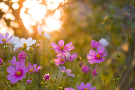 Cosmos flowers blooming in the garden with sunlight at sunset.