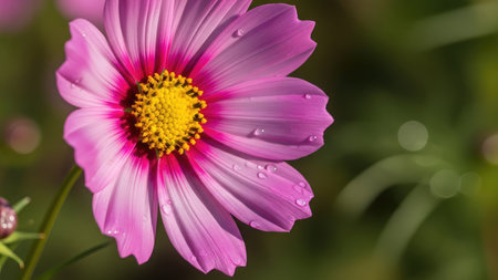 Cosmos flower with water drops on petals, natural background.