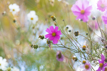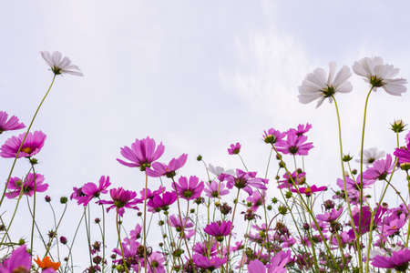 Pink cosmos flowers garden against sunbeams in the morning over clear empty sky with copy space for text, Summer love nature Concept background