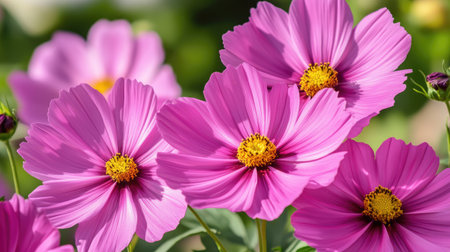 A stunning close-up of vibrant pink cosmos flowers showcasing their delicate petals and bright yellow centers. Perfect for nature and garden themes.