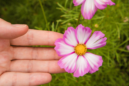 Cosmea flower or Mexican aster pink flower in a female gardener's hand. Planting and care of the plant in a garden. Perennial plants in full bloom in summer day. Beautiful fingers and flower head.