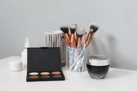 makeup brushes eyeshadow collection professional cosmetics on gray background