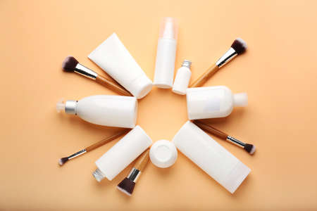 Composition with different cosmetic products and makeup brushes on color background, top view