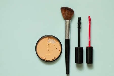 foundation powder broken and lipstick brush red on blue background, makeup set
