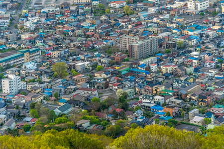 Hakodate cityscape in springtime sunny day cherry blossom full bloom season. The roadside is full of cherry trees, people enjoy it very much. Hokkaido, Japan