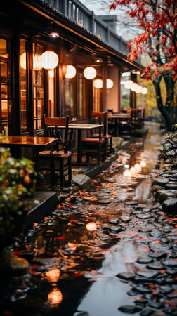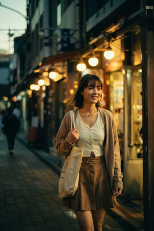 A woman walks leisurely down an enchanting street, illuminated by soft glowing lights from nearby shops as dusk settles in.