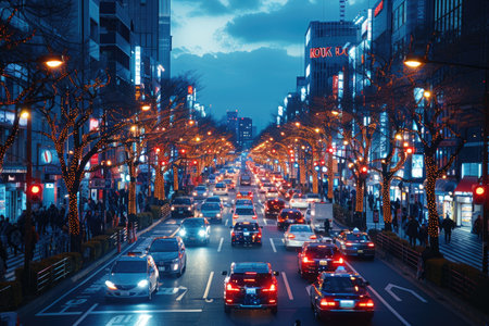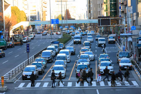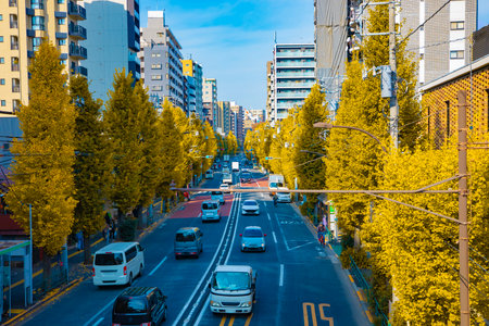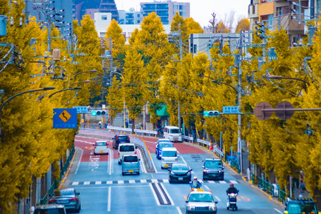 A cityscape of traffic jam at the yellow gingko street in Tokyo