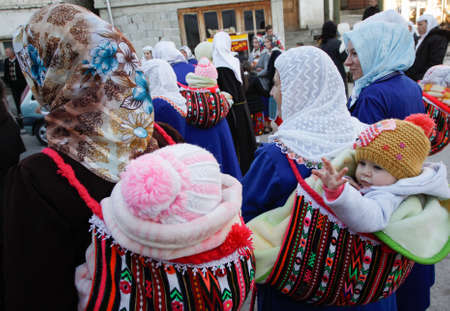 RIBNOVO, BULGARIA - FEBRUARY 14: Children hangs in a traditional woolen sack from the back of their mothers, during the wedding ceremony of Azim Liumankov and Fikrie Bindzheva, Feb 14, 2015, Ribnovo, Bulgaria.