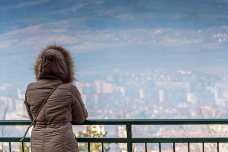 BELGRADE, SERBIA - FEBRUARY 14, 2021: Selective blur on aman waiting for a bus at a belgrade Bus stop sign belonging to GSP Beograd. GSP Beograd is the Belgrade city public transporation company.