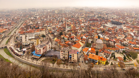 Urban panorama with mosque dome, minaret and residential buildings forming a dense city center under overcast daylight conditions, Prizren, Kosovo