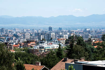 Sofia, Bulgaria. 06-06-2019. Panoramic view of the city of Sofia surrounded by mountains on a sunny summer day. Blue sky and mountains in the haze.