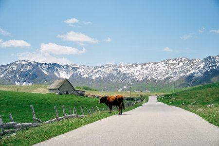 Brown bull stands by the road and looks at the green lawn against the backdrop of snowy mountains