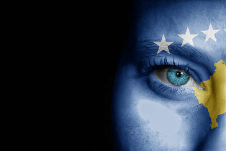 A young female with the flag of Kosovo painted on her face on her way to a sporting event to show her support.