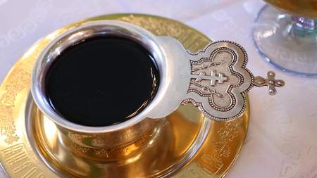 Cup filled with wine for wedding. Various accessories for the wedding in the church in Ukraine.