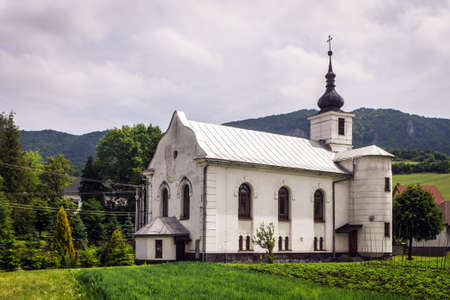 White Catholic church in the north of Slovakia, near the small village Sulov near Zilina. Church against the rocky ridge among green grass
