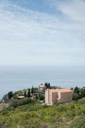 House on the sea shore blue sky green fields