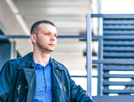 A young man in a blue coat and shirt stands on an iron staircase and looks into the distance. A young, handsome businessman in a business center.
