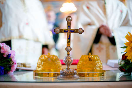 Close-up of details from church ceremony at wedding, holy cross and wedding crowns