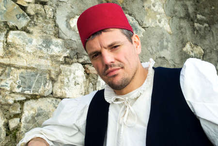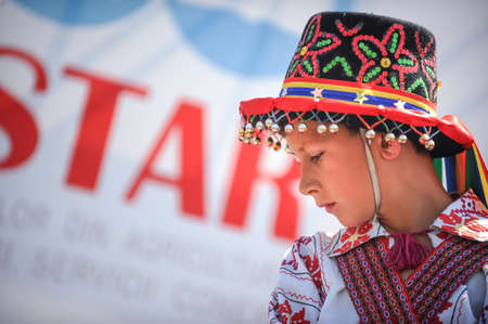 Bucharest, Romania - May 9, 2010: Portrait of a young boy dressed in a traditional costume of the Romanian ancient dancers Calusarii.