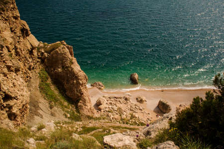 Aerial view of the blue water coast line on Hvar, Brac, Croatia. Photo from helicopter.