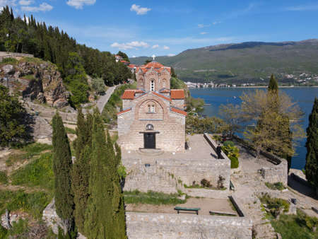 Drone view at the Church of Saint John on the Lake Ohrid on Macedonia