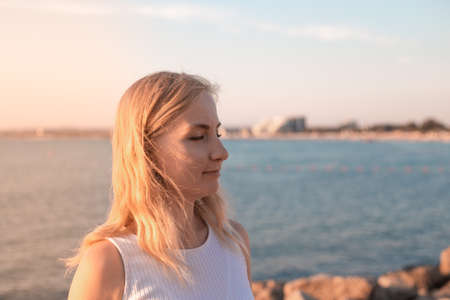 The blonde on the seashore at sunset, closed her eyes, side portrait close-up. Summer vacation on the coast.
