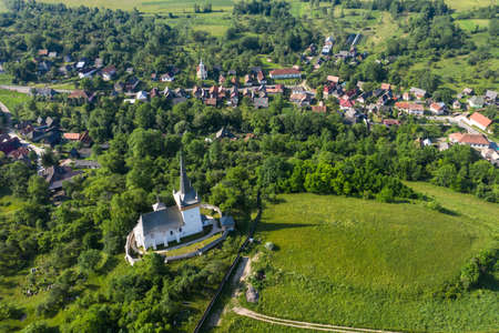 Aerial view of Valeni (Magyarvalko) reformed church, Transylvania, Romania