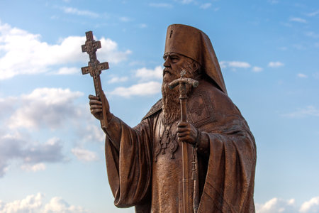 A statue of a man holding a cross and a staff. The statue is of a religious figure