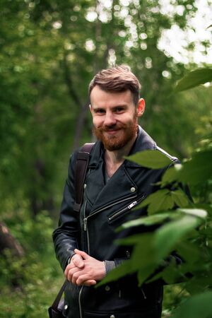 A man with a beard and a red mustache in a black jacket smiles slyly hiding behind the foliage and rubbing his hands.