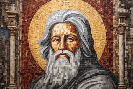 A unique mosaic artwork depicting a man with a long beard. This captivating piece can be used to add an artistic touch to various projects.