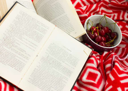 The book and red ripe cherries. Two ripe cherries look out of the book. Cherries as an unusual bookmark for the book. Notebook for Recipes and Cherries.the concept of summer vacation and relax