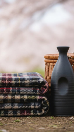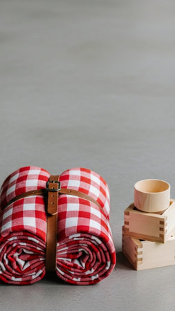 A tall, vertical (9:16) still life photograph showing essential picnic gear. A bright red and white