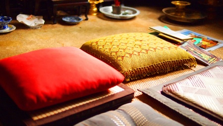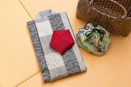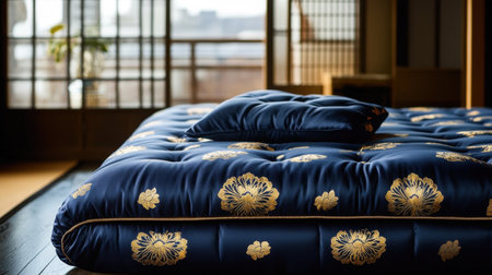 A beautifully arranged Japanese futon features a captivating floral pattern. The soft fabric and serene setting create a calm atmosphere for relaxation and comfort.