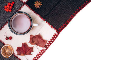 Frame made of autumn leaves, berries and spices on knitted plaid. Flat lay, copy space for your text.