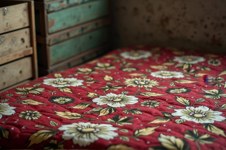 Vintage floral quilt on bed in rustic room with wooden drawers and weathered walls. That the image is generated using AI.