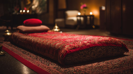 Luxurious red bedding on ornate rug creates warm and inviting atmosphere, perfect for relaxation and comfort. Soft cushions enhance cozy setting, ideal for unwinding