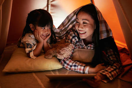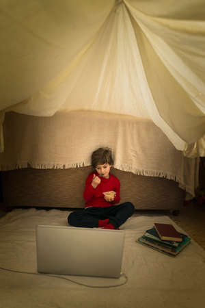 A child sitting on a blanket looking at a laptop in a makeshift tent in his living room. Home lifestyle concept.