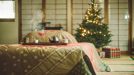 A steaming teapot and cups sit on a bed in a Japanese-style room with a decorated Christmas tree in the background.
