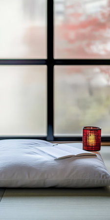 A soft cushion is placed on the floor by a large window illuminated by warm candlelight. The tranquility is enhanced by the gentle light filtering through the glass.