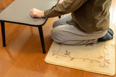 Japanese living room with kotatsu - table with heating and attached blanket for winter warmth.