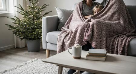 Cozy Family Moments and Screen Time. A family watches a film under a shared blanket, sharing laughs and popcorn.
