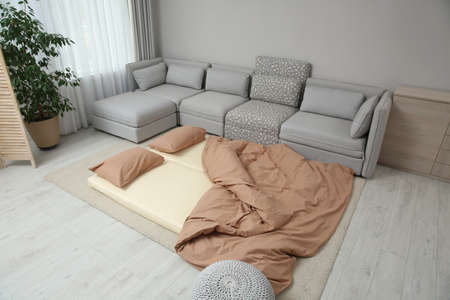 Mattress with pillows and blanket on floor near sofa. Additional sleep place for guest