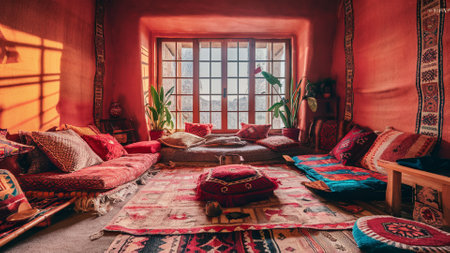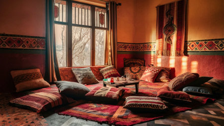 The interior of the room is in the style of ethno. A room lit by light from a window. AI generated.
