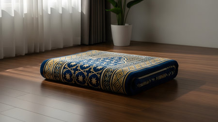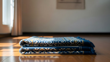A neatly folded blue prayer rug with intricate geometric patterns rests on a polished wooden floor. Sunlight streams into the room, creating a peaceful and spiritual atmosphere for worship.