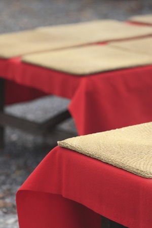 a table adorned with a white cloth showcases a striking arrangement of a blue cup and red and white plates. this contemporary quilt-inspired display, captured with the olympus mzuiko digital ed 45mm f/1.2 pro lens, exudes a rustic americana vibe. the handcrafted designs feature a fusion of light amber and red hues, reminiscent of the bold and aggressive quilting style popularized by donald judd. ai