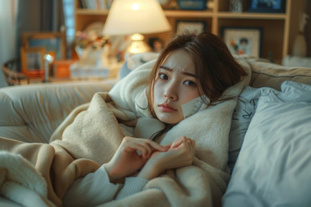 A young woman lying on a sofa looking worriedly at a thermometer, wrapped in a blanket.